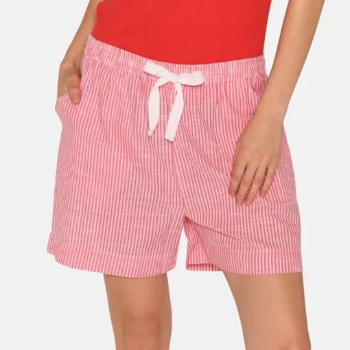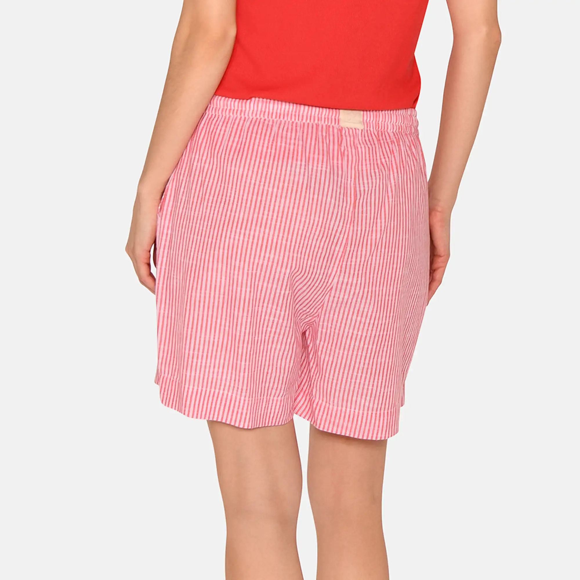 Designet har fine, lodrette striber i bittersweet rød og hvid, som skaber et friskt og sommerligt udtryk. De smalle striber giver et let og feminint look, mens farvespillet tilfører varme og liv til garderoben. Shorts i økologisk bomuld har en elastisk talje med bindebånd, så pasformen nemt kan justeres efter behov.