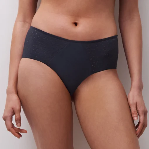 Shorts trusse i marineblå er skabt til dig der ønsker maksimal komfort med et feminint touch. Den høje talje giver en glat og støttende silhuet, mens den bløde blonde bagpå tilføjer et elegant og let udtryk. Det strækbare materiale former sig efter kroppen og sidder behageligt hele dagen uden at stramme. Forstykket er designet i et glat og blødt materiale der sikrer diskretion under tøjet, mens bagsiden har et let transparent blondemønster som fremhæver figuren på en diskret måde. Den brede elastik i taljen giver ekstra støtte og komfort, og den er foret med bomuld i skridtet for optimal åndbarhed. Farven er en dyb marineblå der passer perfekt ind i enhver basisgarderobe og nemt kan matches med bh’er i samme nuance. En ideel hverdagsfavorit der kombinerer funktion og femininitet.