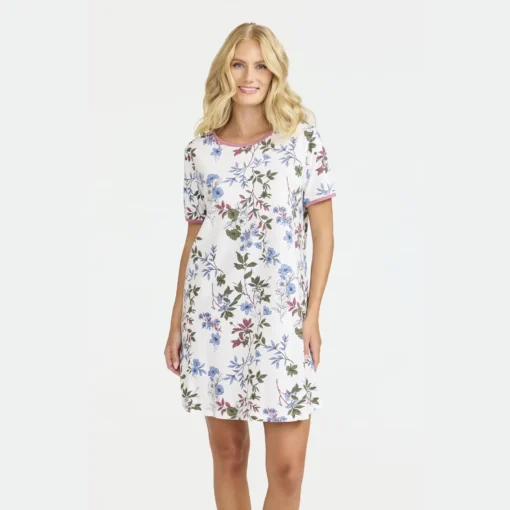 Natkjole fra Damella i en let og blød blanding af bomuld og modal – perfekt til lune nætter og afslappede morgener. Kjolen har en behagelig, løs pasform og er designet med korte ærmer og rund halsudskæring, som giver et afslappet og feminint udtryk. Den hvide bundfarve er dekoreret med et elegant blomsterprint i nuancer af blå, grøn og vinrød, hvilket skaber en frisk og romantisk stemning.