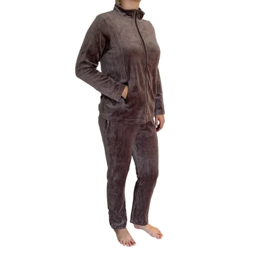 Velour hjemmedragt i taupe med lynlås og lommer