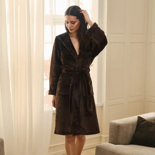 Denne fleece kåbe med hætte i en dyb brun nuance er skabt til maksimal komfort og varme på kølige dage. Den bløde polyesterkvalitet føles behagelig mod huden og holder effektivt på varmen. Med den rummelige hætte kan du nemt pakke dig ekstra godt ind, mens bindebæltet i taljen giver mulighed for at tilpasse pasformen. De praktiske store forlommer gør det let at holde hænderne varme eller opbevare småting. Kåben har et klassisk, tidløst design, der passer perfekt til både rolige morgener og afslappede aftener. Den er ideel til brug efter badet eller som hyggeligt loungewear på hjemmedage. Kvaliteten er slidstærk og nem at vedligeholde, så du kan nyde den sæson efter sæson.