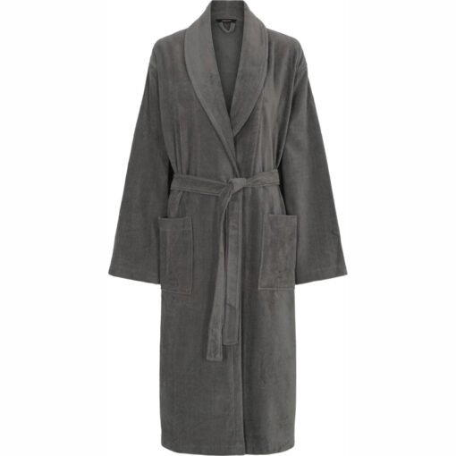 Grå Frotte Kåbe fra Decoy med lang længde, bindebånd, krave og store lommer. Rummelig pasform. Frotte kvalitet suger vand, og kåben er derfor ideel til badekåbe.