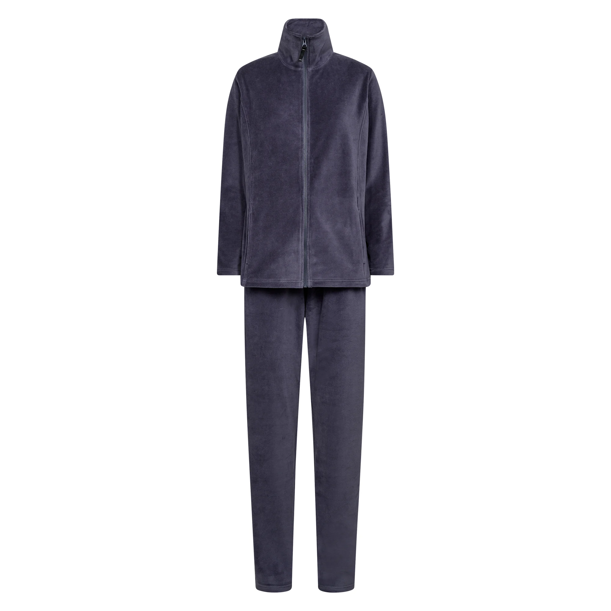 Blå velour hjemmesæt, der kombinerer afslappet komfort med en elegant stil. Sættet består af en jakke med praktisk lynlås, høj krave og to rummelige lommer, perfekt til både afslapning og små gøremål derhjemme. Taljen fremhæves diskret med en flot markering, der giver en pæn pasform. Bukserne har både elastik og justerbart bindebånd i taljen, så du nemt kan opnå den perfekte komfort hele dagen.