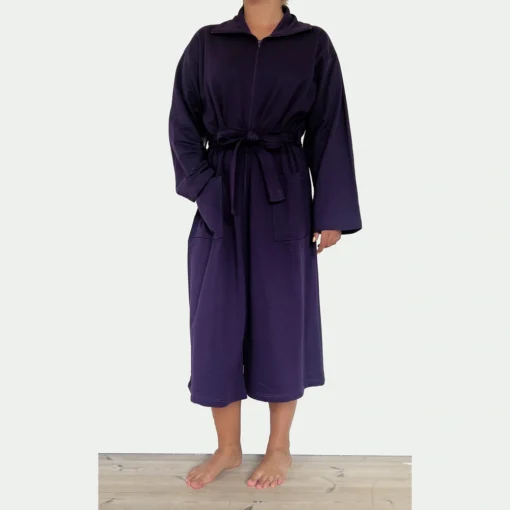 Randers Kåben fra JBA i 100% bomuld, i denne fine mørke lilla farve. Kåben har en lækker hverdags bomulds kvalitet med en blød børstet inderside. Kåben har en bred krave rund i halsudskæringen og er uden hætte. Den har både lynlås og bindebånd. En størrelse M måler ca. 123cm i brystvidden samt 120 i længden.