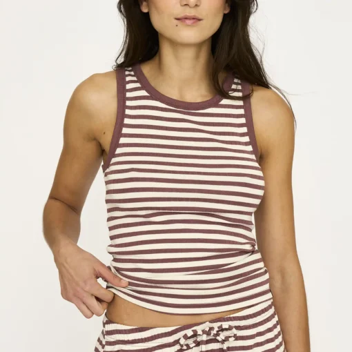 Denne ribbede tank top fra JBS of Denmark er fremstillet i en luksuriøs blanding af økologisk bambusviskose, økologisk bomuld og en smule elastan, som tilsammen giver en let strækbar og åndbar kvalitet. Den bløde struktur føles behagelig mod huden og giver en afslappet pasform, der følger kroppens naturlige bevægelser. Toppen er designet i et stilrent stribemønster med en varm rød tone kombineret med klassisk råhvid, der skaber et tidløst, nordisk inspireret udtryk. Rund halsudskæring og kontrastkant ved ærmegab giver et enkelt og velafbalanceret finish. Perfekt til både hverdag og afslapning derhjemme, men også let at style under en cardigan eller skjorte for et mere sammensat look. Materialet er certificeret økologisk og ideelt til dig, der ønsker komfort, kvalitet og bæredygtighed i garderoben.