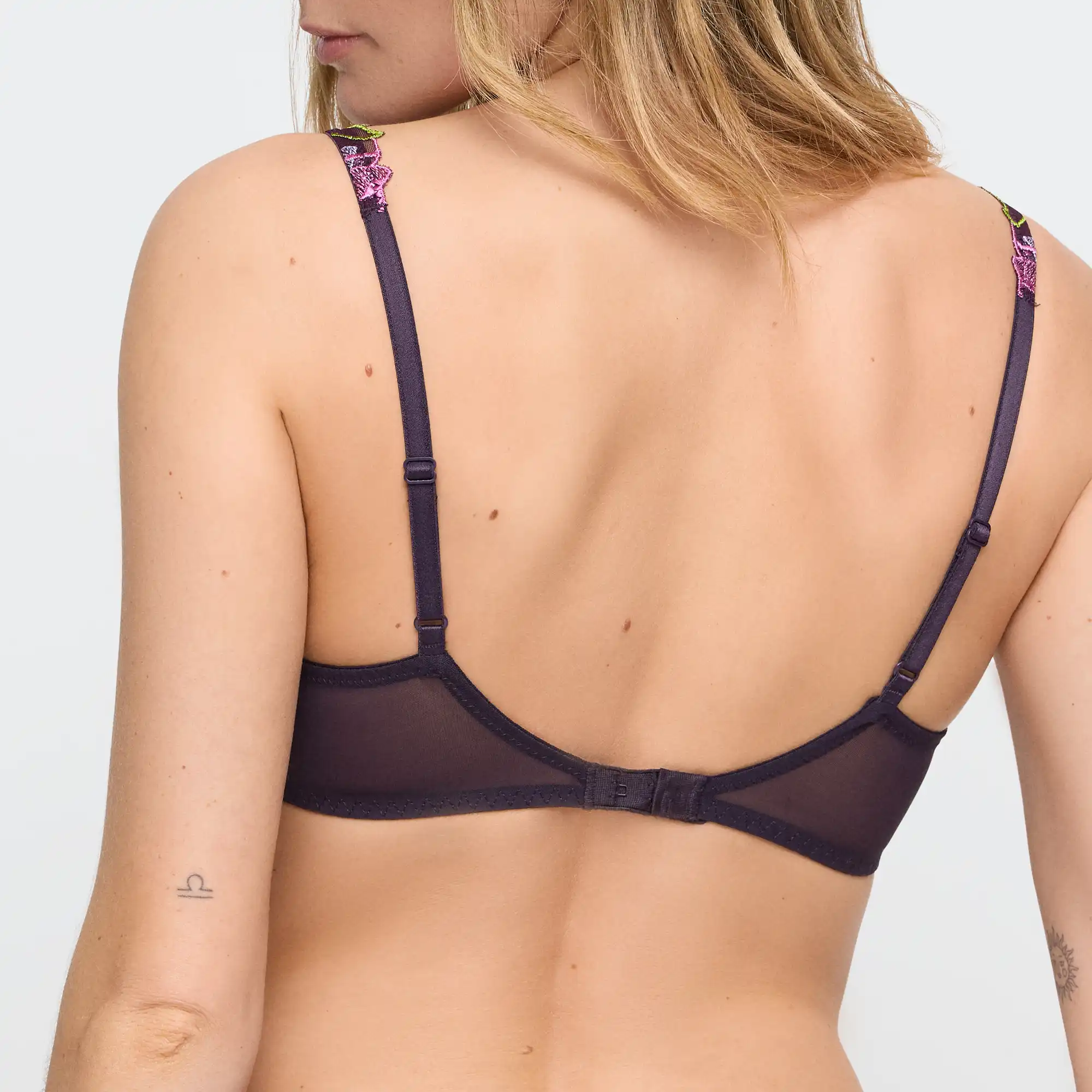 Plunge bh’en fra Marie Jo Loish er skabt til at fremhæve din naturlige kavalergang med en dyb og flatterende udskæring. Denne bh uden vattering har faste bøjler, som løfter og støtter barmen smukt, samtidig med at den giver en let og feminin fornemmelse mod huden. Den dybe lilla amethyst farve danner en fortryllende baggrund for det farverige blomsterbroderi i pink, lilla og limegrønne nuancer. Skålene er i transparent mesh og dekoreret med fine blade og blomster, der giver et legende og eksklusivt udtryk. Det samme broderi pryder stropperne og gør dem ekstra dekorative – perfekte til at lade titte frem under en top eller kjole. Ryggen er lavet i blødt mesh med lukning og justerbare stropper for maksimal komfort. Denne plunge bh er et ideelt valg, hvis du ønsker et sofistikeret og sensuelt look til både hverdag og fest. Matcher smukt med tai eller string trusser fra samme serie.