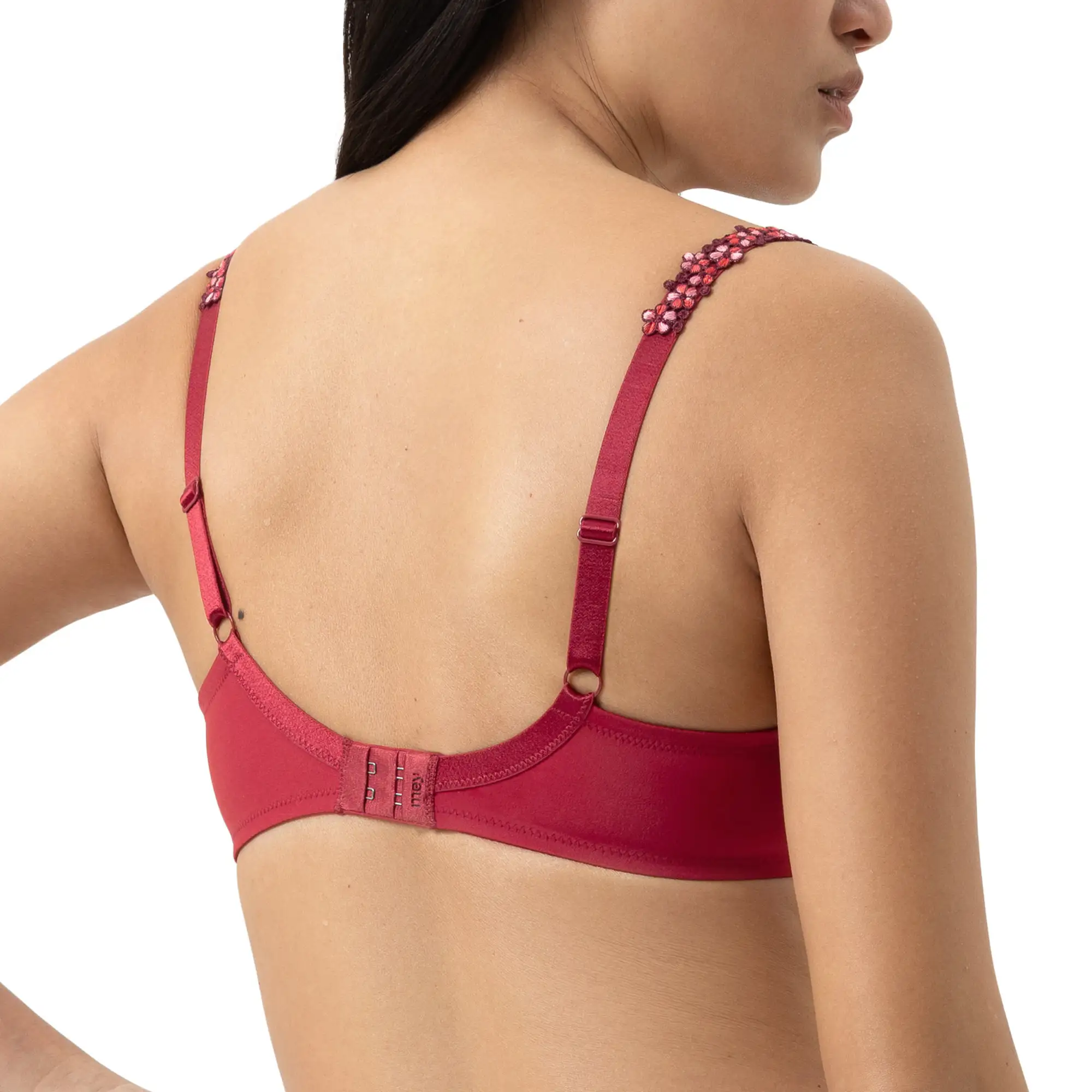 Skålene er udsmykket med detaljeret blomsterbroderi i nuancer af rød og rosa, som skaber et feminint og eksklusivt udtryk. De øverste dele af skålene er let transparente, mens den nederste del giver diskret dækning. Stropperne er justerbare og prydet med små broderede blomster, der fuldender det sofistikerede look.