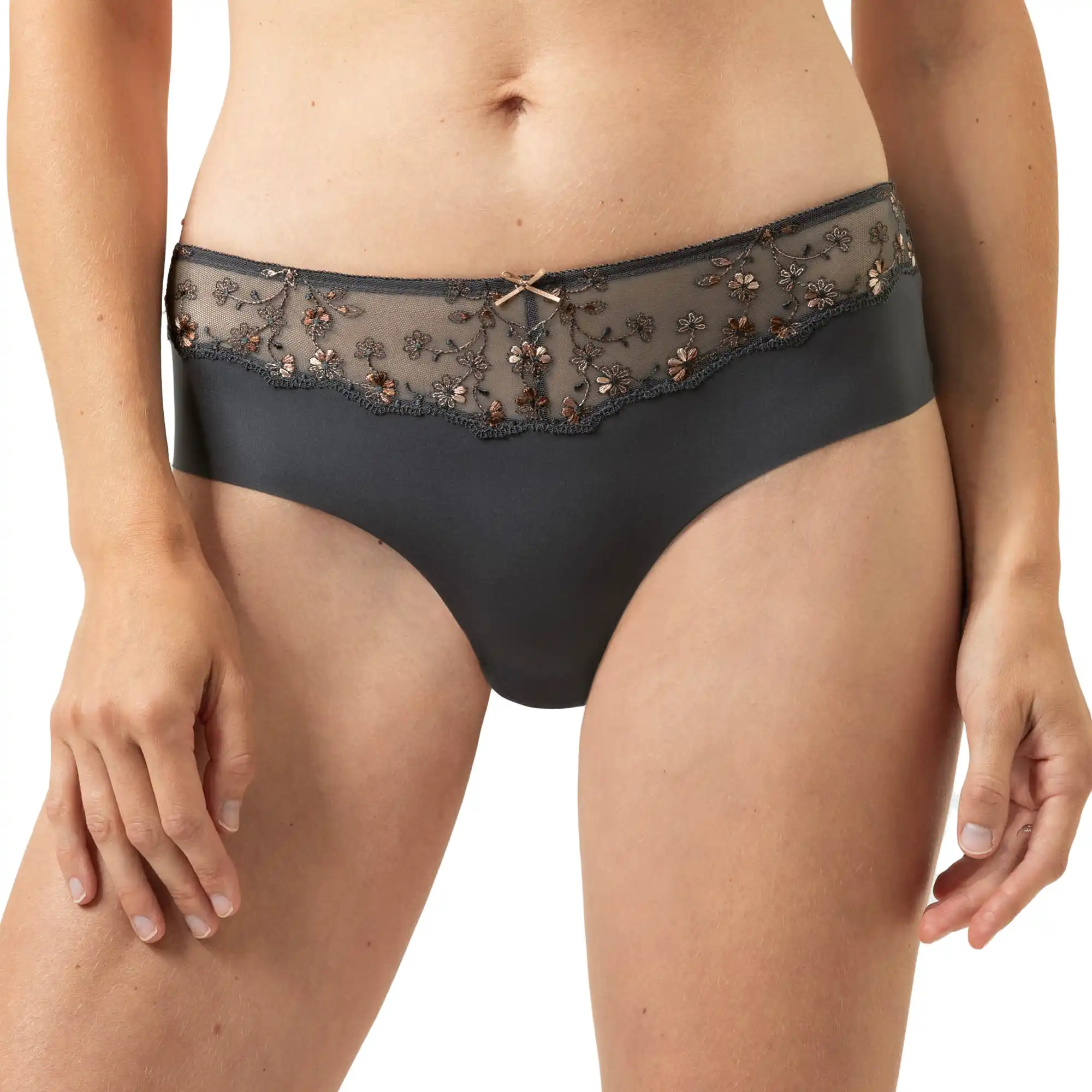 Trussens front er dekoreret med delikate blondedetaljer og fine blomsterbroderier i grå og kobberfarvede nuancer, som tilfører et elegant og sofistikeret spil. De flade kanter omkring benene gør den behagelig at have på hele dagen og sikrer, at den ikke ses under tøjet.