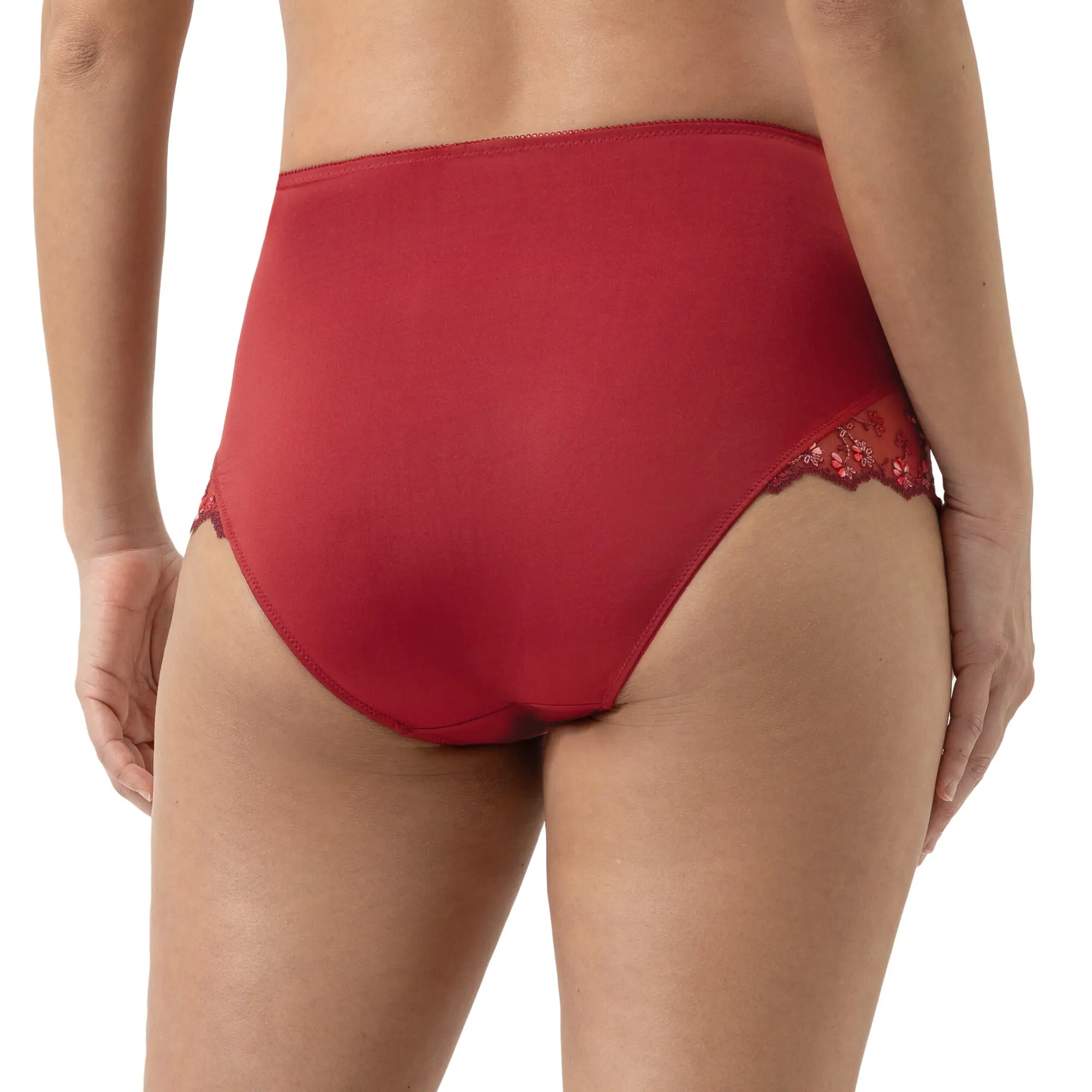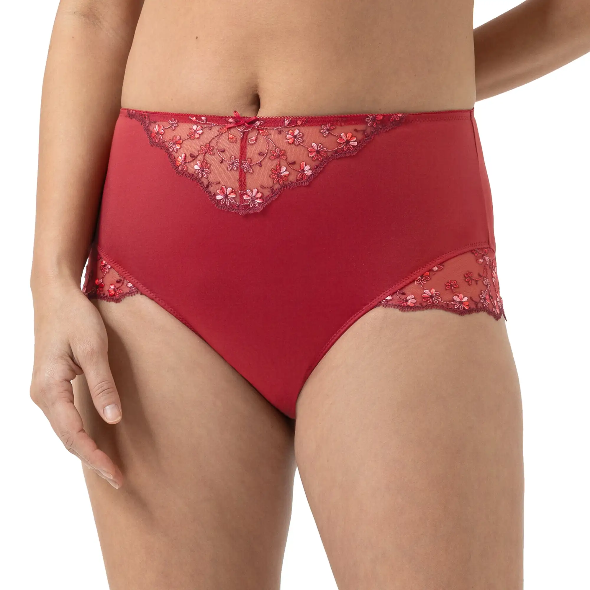 Fronten prydes af delikate blondedetaljer med små blomsterbroderier i rosé- og rødtoner, som tilfører et strejf af romantik og raffinement. Bagstykket er holdt glat for at sikre et usynligt look under tøjet, mens den fine kantafslutning ved benene sikrer, at trussen bliver siddende perfekt hele dagen.