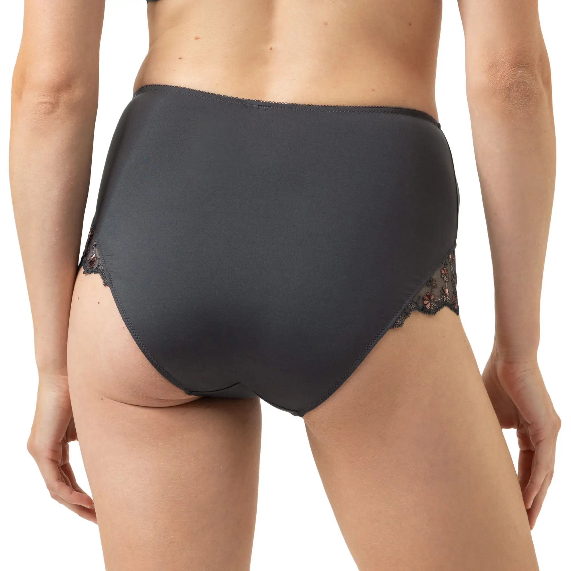 Fronten er dekoreret med fin blonde i grå og kobberfarvede nuancer, der danner et diskret blomsterbroderi for et feminint og eksklusivt udtryk. Bagsiden er glat, så trussen forbliver usynlig under tøjet, mens de bløde kanter ved benene sikrer perfekt komfort hele dagen.