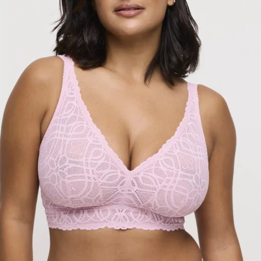 Bralette uden bøjle i en romantisk støvet rosa nuance, der kombinerer vintage charme med moderne komfort. Denne model er fremstillet i en smuk, grafisk blonde og har en longline pasform, som giver ekstra støtte under barmen perfekt til dig, der ønsker et naturligt løft uden bøjler. Den dybe V-udskæring fremhæver barmen på elegant vis, mens det brede blondebånd forneden sikrer, at braletten sidder stabilt hele dagen. Det let transparente materiale giver en feminin finish, og de brede, justerbare stropper gør den både komfortabel og flatterende, uanset kropsform. Lukningen bagpå består af hægter, som giver en sikker og fleksibel pasform. Braletten er ideel til både afslappede dage og som en del af et luksuriøst undertøjssæt. En stilfuld løsning for dig, der prioriterer både blød komfort og raffineret design.