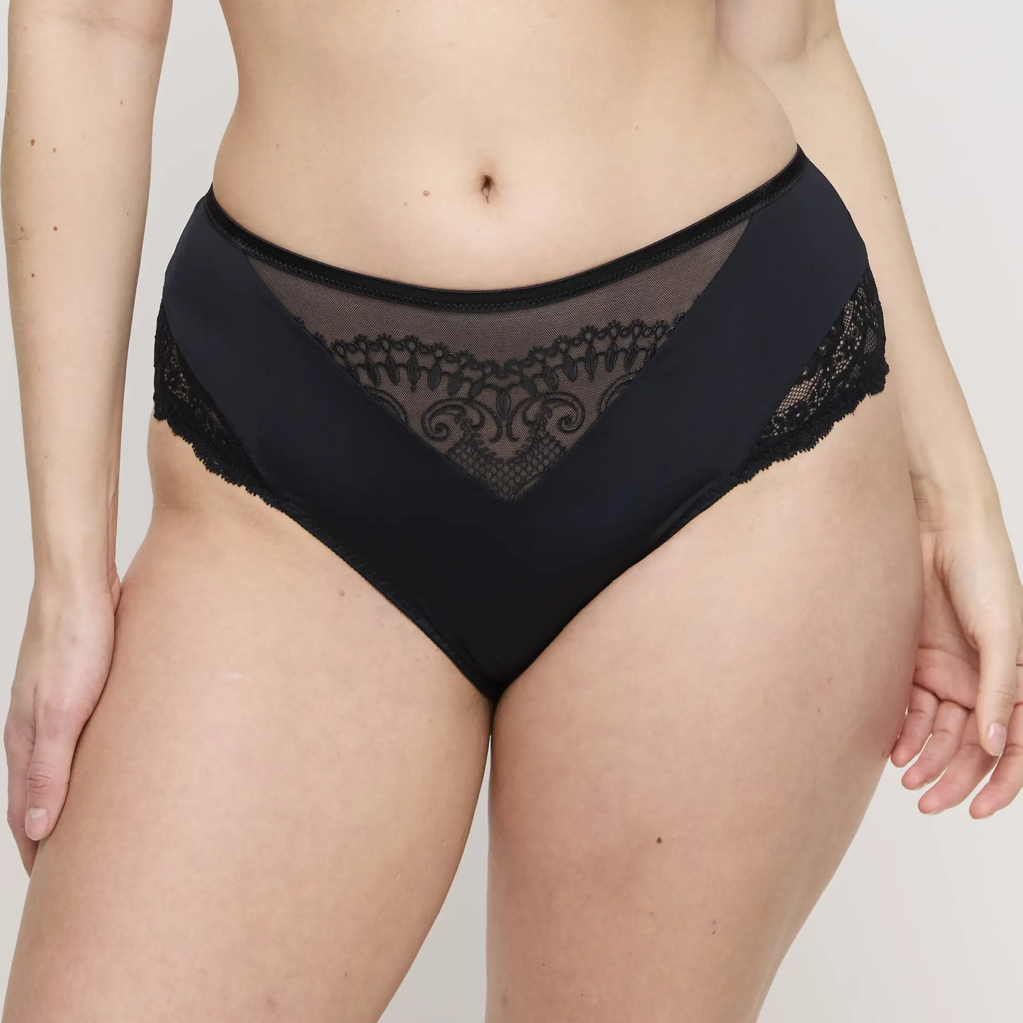 Maxi trusse i sort fra PrimaDonna Shimla kombinerer komfort og luksus i et elegant design. Forsiden har et smukt V-formet panel i transparent mesh, prydet med delikat italiensk broderi, der tilfører et feminint og eksklusivt udtryk. De bløde mikrofiberpaneler giver en behagelig fornemmelse mod huden og sikrer en glat silhuet under tøjet. Siderne og bagstykket er udført i elastisk sort blonde med fine blomsterdetaljer, som smyger sig om formerne og fremhæver figuren på en flatterende måde. Den høje talje giver ekstra støtte og en let shaping-effekt, mens den fulde bagdækning sørger for maksimal komfort hele dagen. Den sorte farve gør trussen tidløs og alsidig, perfekt både til daglig brug og til særlige anledninger. Kombinér med den matchende PrimaDonna Shimla bh for et gennemført og stilfuldt lingerisæt.
