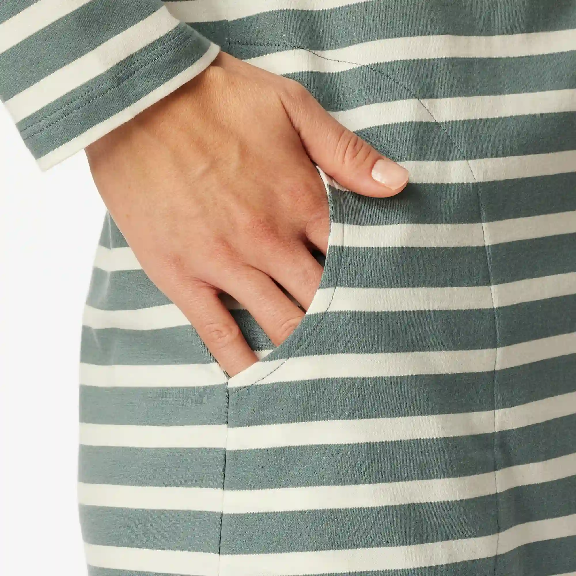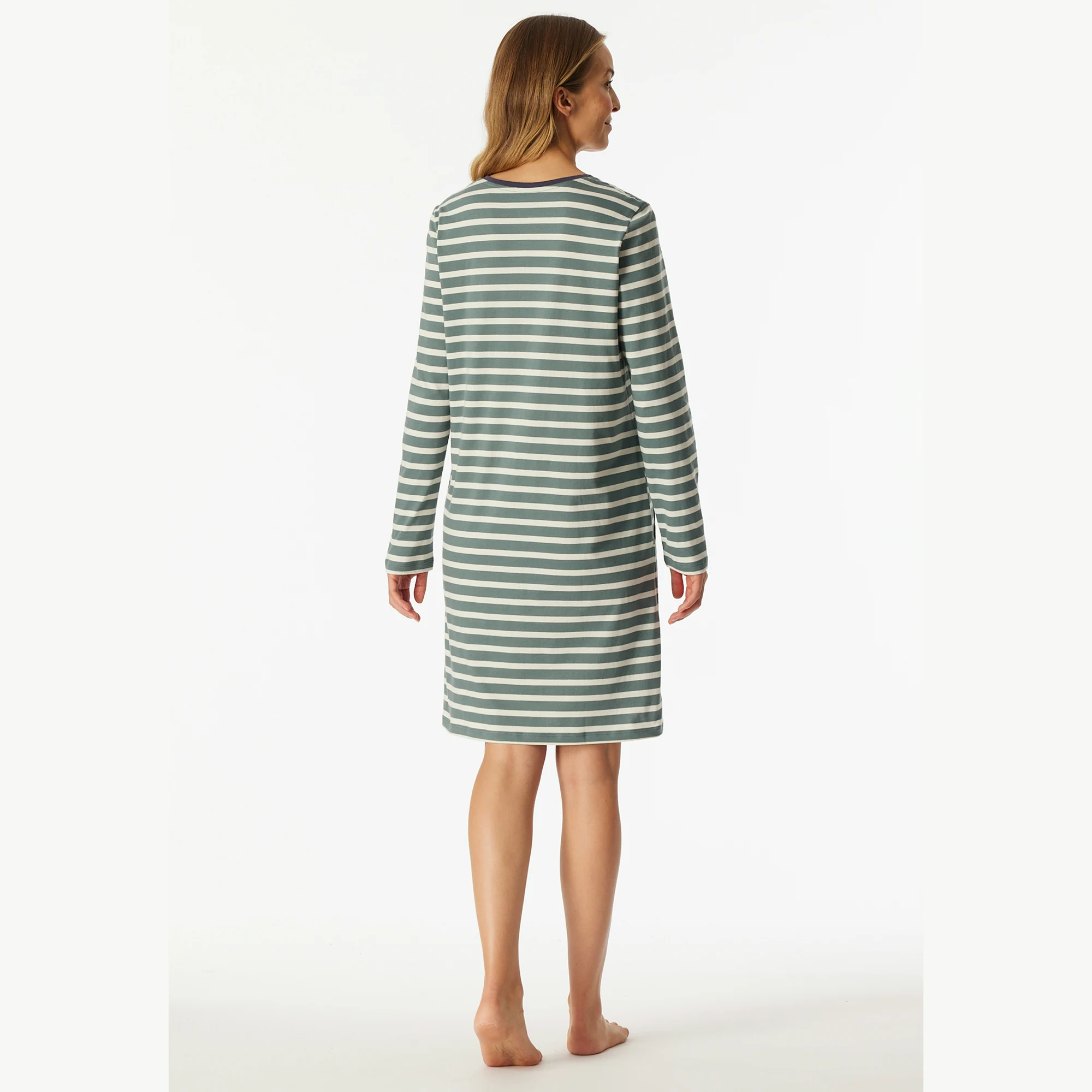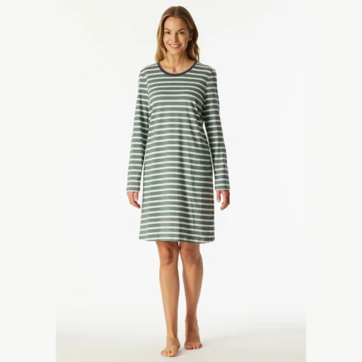 Denne natkjole med lange ærmer er perfekt til dig, der ønsker komfort og bevægelsesfrihed i et stilrent design. Natkjolen har et klassisk stribet mønster i mineralgrøn og cremehvid, som giver et friskt og roligt udtryk – ideel til afslapning og nattero. Den rundede halsudskæring er fint markeret med en mørkere kontrastkant, der tilføjer en diskret detalje til det ellers enkle look.