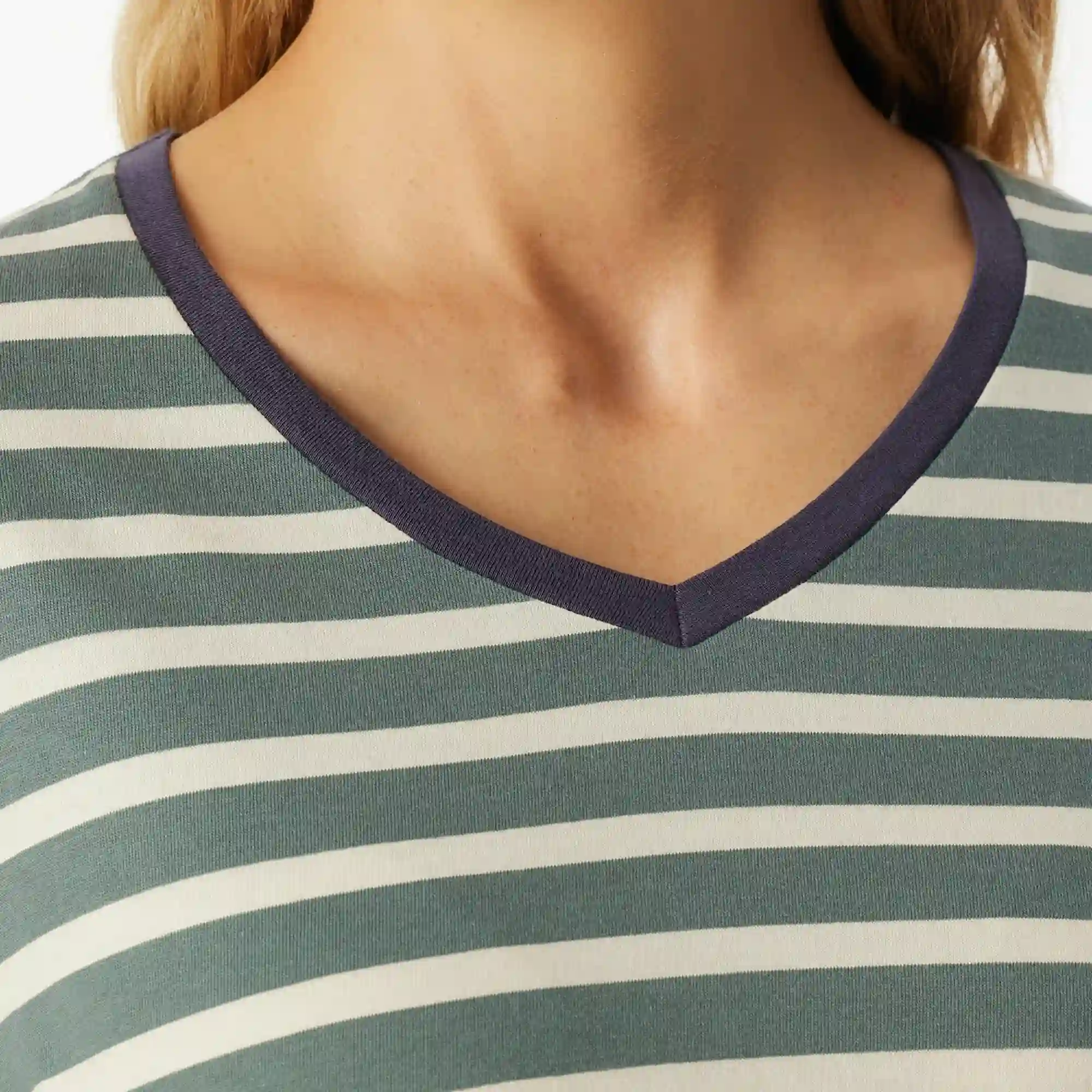 Denne pyjamas til damer kombinerer komfort med et tidløst udtryk, perfekt til hyggelige aftener og afslappende nætter. Overdelen har lange ærmer og et flot V-udskæring, indrammet af en mørklilla kant, som fremhæver det klassiske stribede mønster i mineralgrøn og cremehvid. Pasformen er løs og afslappet, hvilket giver optimal bevægelsesfrihed hele natten.