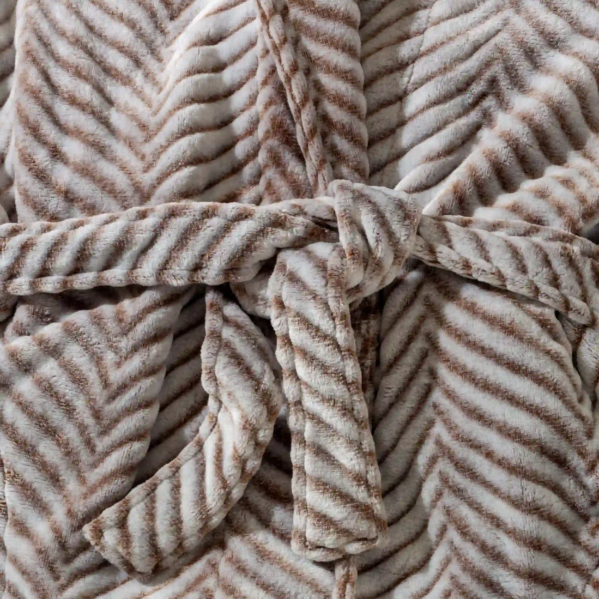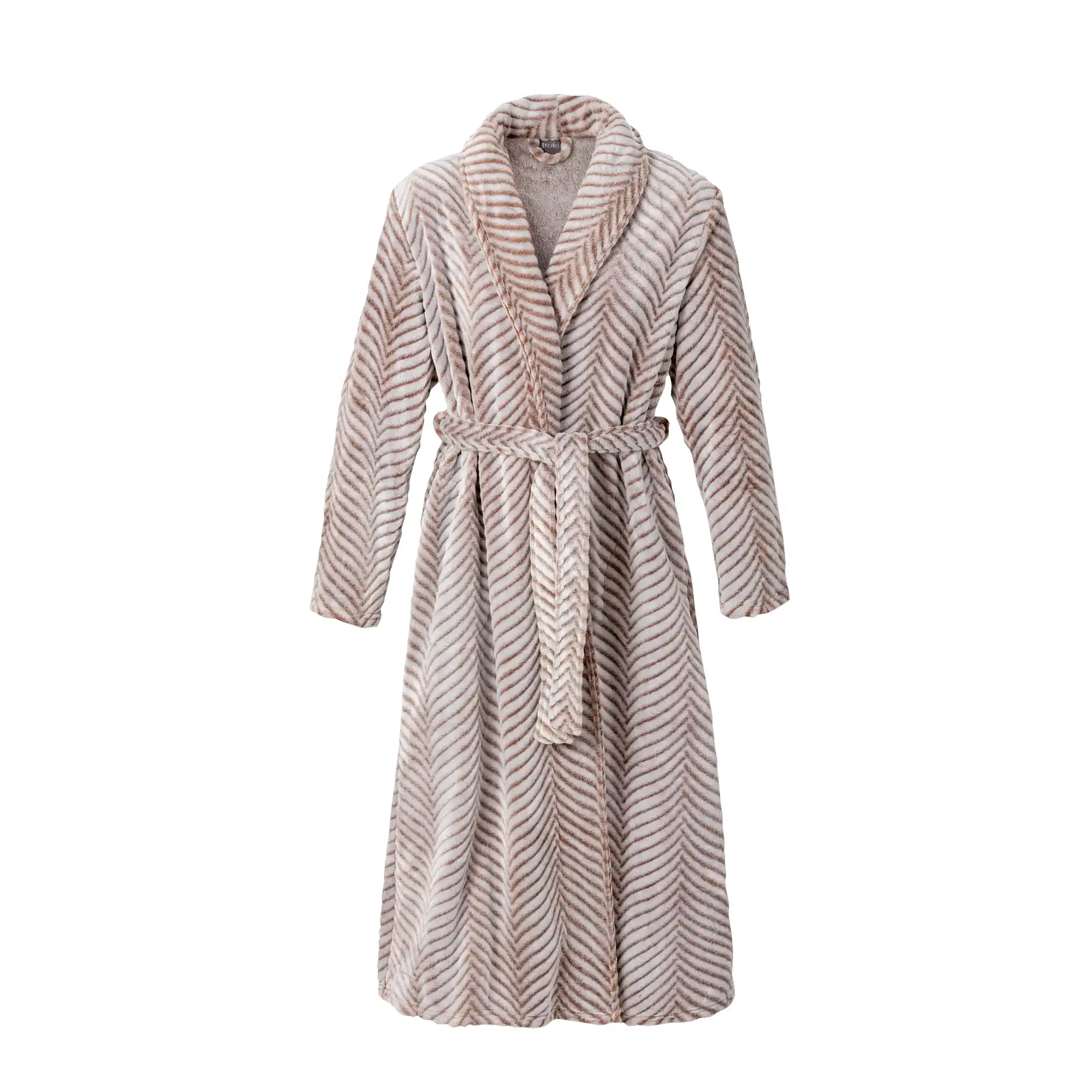 Denne brune kåbe i 100% polyester er skabt til at give både varme og komfort på kølige dage. Stoffet er lavet i blød fleece og prydet med et markant mønster i lyse og mørke nuancer, der giver et levende og moderne udtryk. Den klassiske sjalskrave understøtter designets hyggelige stil, mens bindebæltet i taljen giver mulighed for at tilpasse pasformen efter behov. Med sin længde, der går til under knæet, får du en model, som både føles dækkende og elegant. De praktiske sidelommer tilfører funktionalitet, så du kan opbevare småting eller blot lune hænderne. Kåben er ideel til brug året rundt og giver en følelse af velvære, uanset om den bruges om morgenen, efter badet eller til afslapning i sofaen. Denne model skiller sig særligt ud med sit bløde strukturmønster i brune nuancer, der tilfører et naturligt og varmt udtryk. Et oplagt valg til dig, der ønsker en kombination af komfort, funktionalitet og et stilfuldt design.
