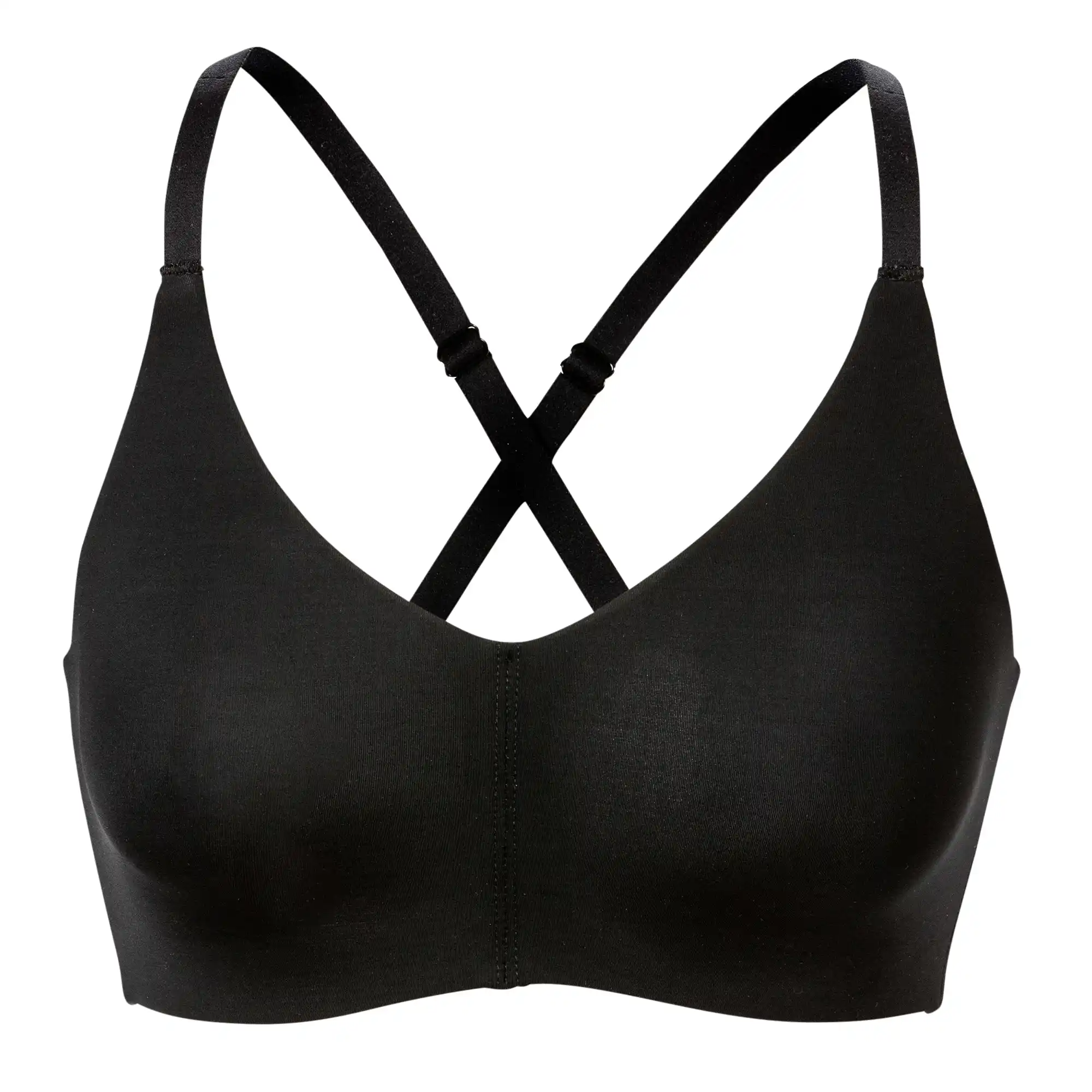 Bh uden bøjle med vattering er højere foran og i siderne, hvilket giver ekstra støtte og en omsluttende fornemmelse. Den brede ryg bidrager til stabilitet, også i større størrelser. Stropperne kan justeres og samles til X ryg, så pasformen kan tilpasses både hverdag og aktive dage.