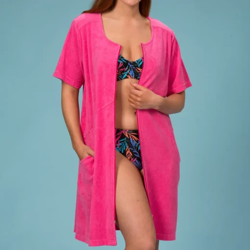 Rosa bomulds frotte kåbe med korte ærmer og 2 store lommer. Åbenes foran med fuld længde lynlås. Ideel til at tage ud over badetøjet, da frotte materialet suger godt vand.