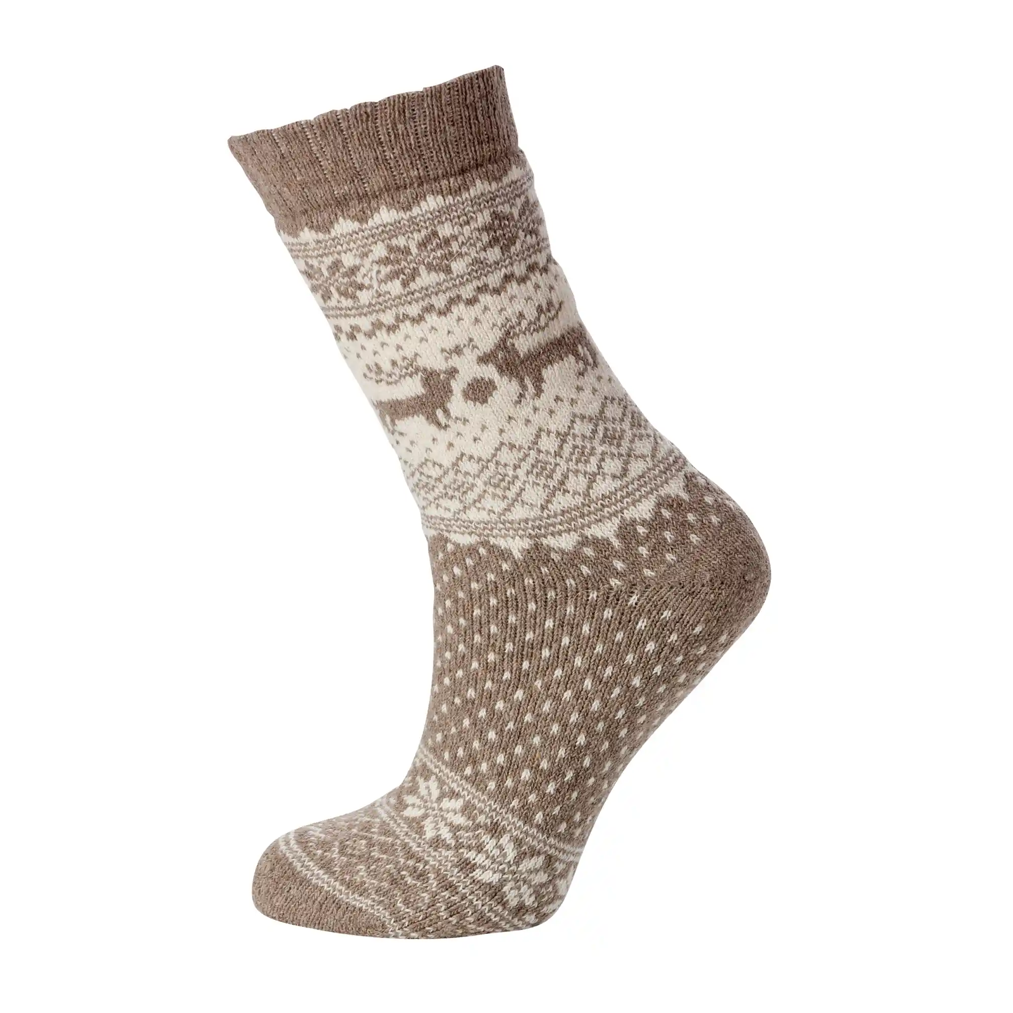 Disse lysebrune uld strømper er skabt til at give varme og komfort på kolde dage. De er fremstillet i en blanding af 45% uld, 35% akryl, 15% polyester og 5% elastan, hvilket sikrer en blød og fleksibel kvalitet, der både isolerer og holder formen. Indersiden er vævet med frotté, som gør strømperne ekstra lune og behagelige at have på i mange timer ad gangen. Det dekorative strikkede mønster i hvid og brun giver et hyggeligt vinterligt udtryk, hvor små rensdyr og klassiske nordiske detaljer pryder skaftet. Ribkanten øverst sørger for, at strømperne bliver siddende godt uden at stramme, mens hæl og tå er forstærket for øget slidstyrke. Med deres charmerende mønster er disse strømper et ideelt valg til vinterhygge i hjemmet, men de fungerer også perfekt i støvler, når du skal ud i kulden. Kombinationen af funktion og design gør dem til et must-have for dig, der ønsker både varme fødder og et stilfuldt udtryk i garderoben.