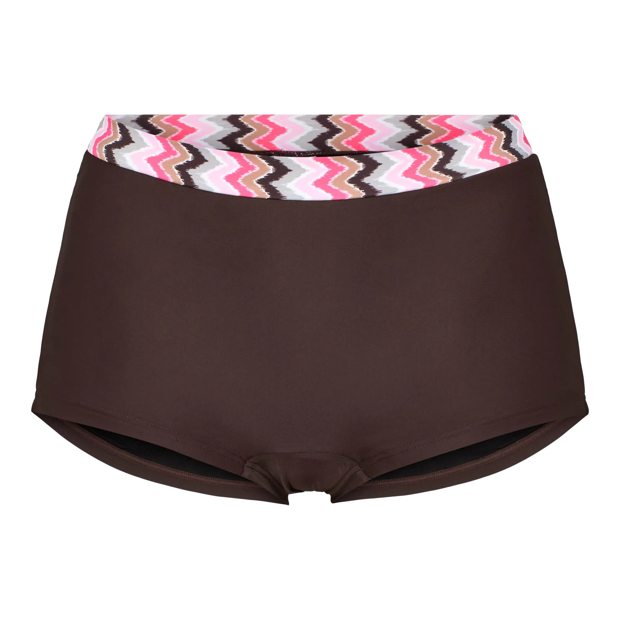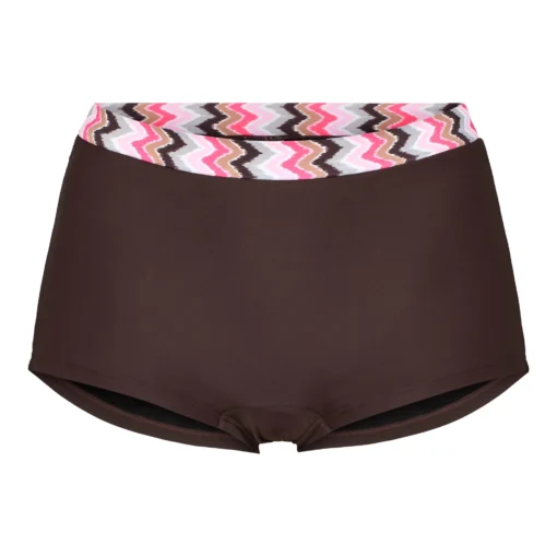 Den ensfarvede, dybe brun nuance skaber et stilrent og tidløst udtryk, mens den mønstrede linning tilfører et diskret, grafisk spil, der giver trussen karakter uden at dominere. Farvekombinationen gør den nem at matche med både ensfarvede og mønstrede bikini toppe – særligt fra samme serie.